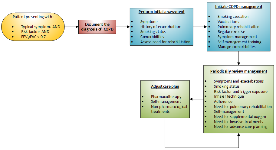 - GOLD recommends modifying COPD treatment based on a “review, assess, then adjust” process.